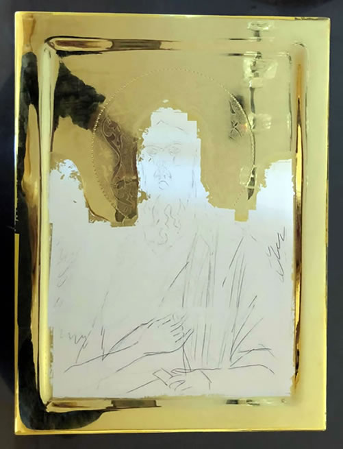 The background of the icons can be either color or 22K gold foil.The golden background can be made with either the olive gilding technique or the water gilding technique,with or without wrought iron byzantine ornaments(tsoukaniko).